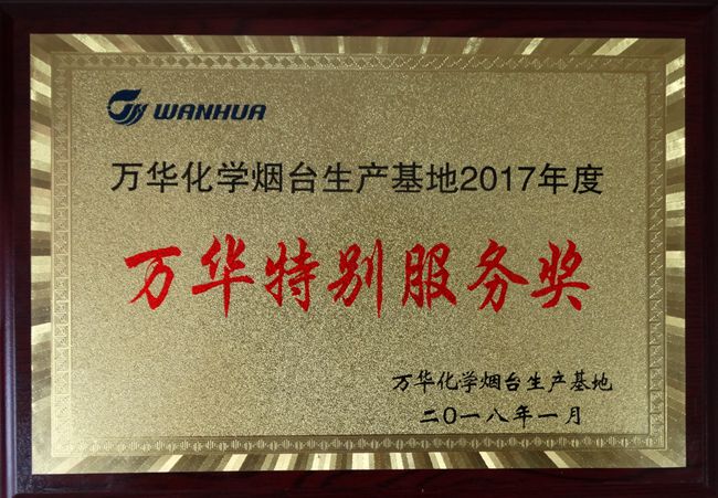 近日,在萬華化學煙臺生產基地舉行的2018年員工大會上,我公司煙臺分公司以優良的業績,從十幾家承包商中脫穎而出,成為獲得2017年“萬華特別服務獎”榮譽的兩家單位之一。這是煙臺分公司繼蟬聯“萬華煙臺優秀承包商”殊榮后,再獲業主表彰的重要大獎,體現了萬華煙臺生產基地對2017年“齊魯建設”檢維修業績與管理水平的充分肯定和認可,彰顯了“齊魯建設”的品牌形象。